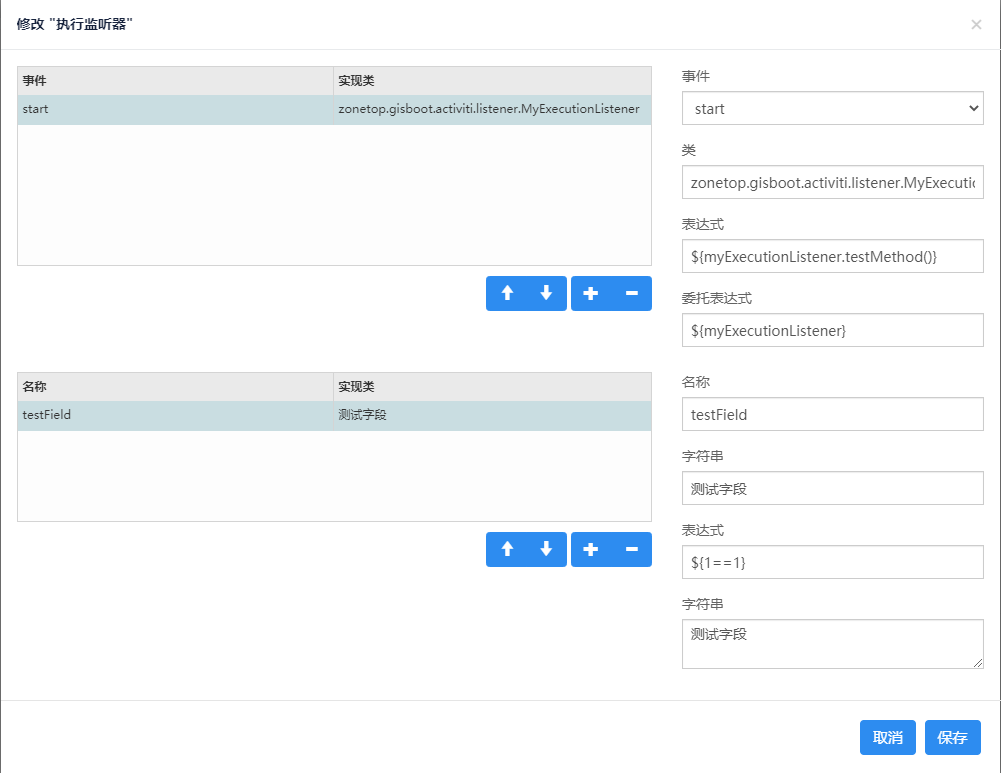 **字段:** 可以为每个监听器配置字段属性。字段有名称、字符串、表达式几个可输入值,在代码中,根据name的名称相应获取配置值。代码中定义的成员变量名称必须和监听器中定义的字段名称一致才能获取到值。