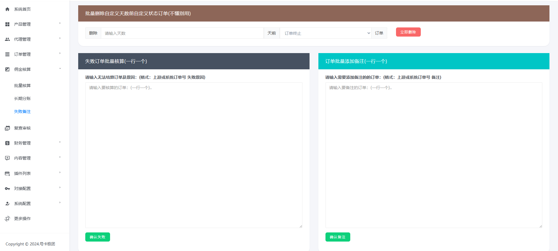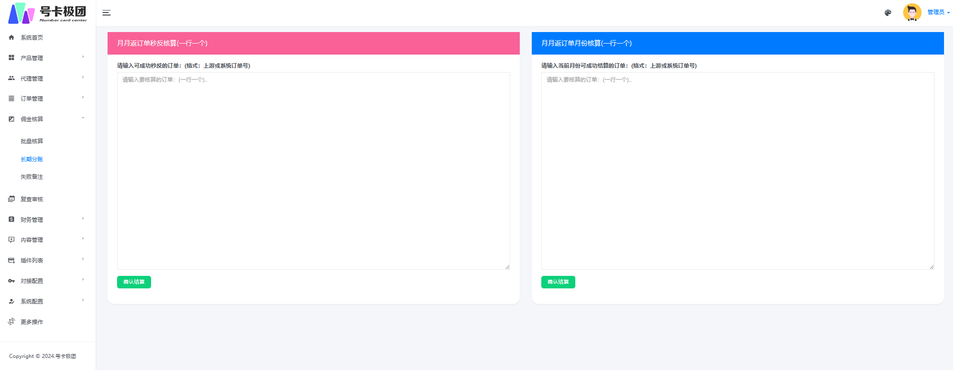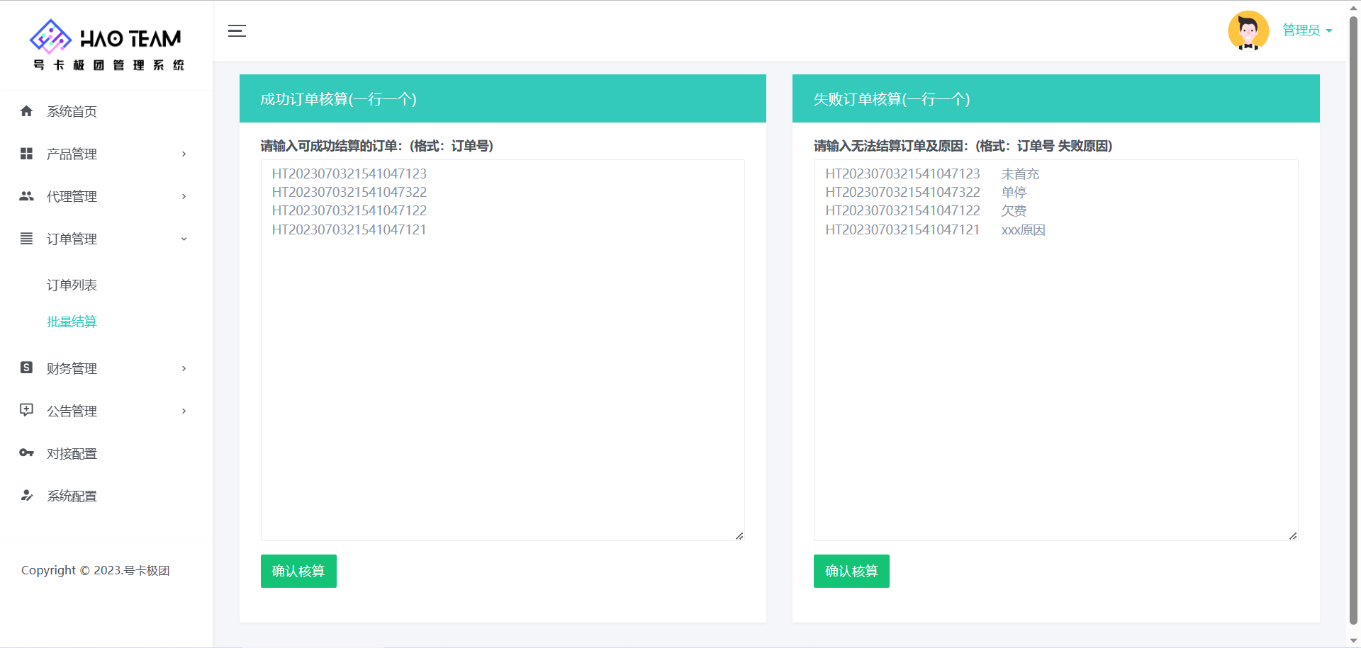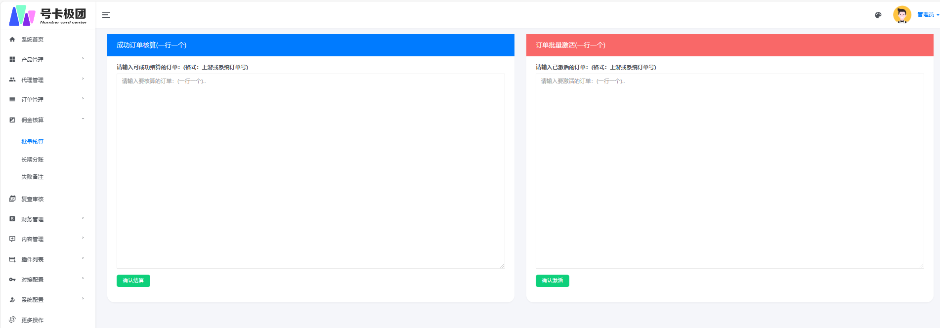 成功订单核算:只输入订单号,且一行一个,多个换行输入,核算后便会计算该笔订单每个代理应得多少,会根据输入的本地订单号依次进行处理,将该订单状态置为已结算,并将订单关联的所有预估收入置为实际收入并到账代理商余额。