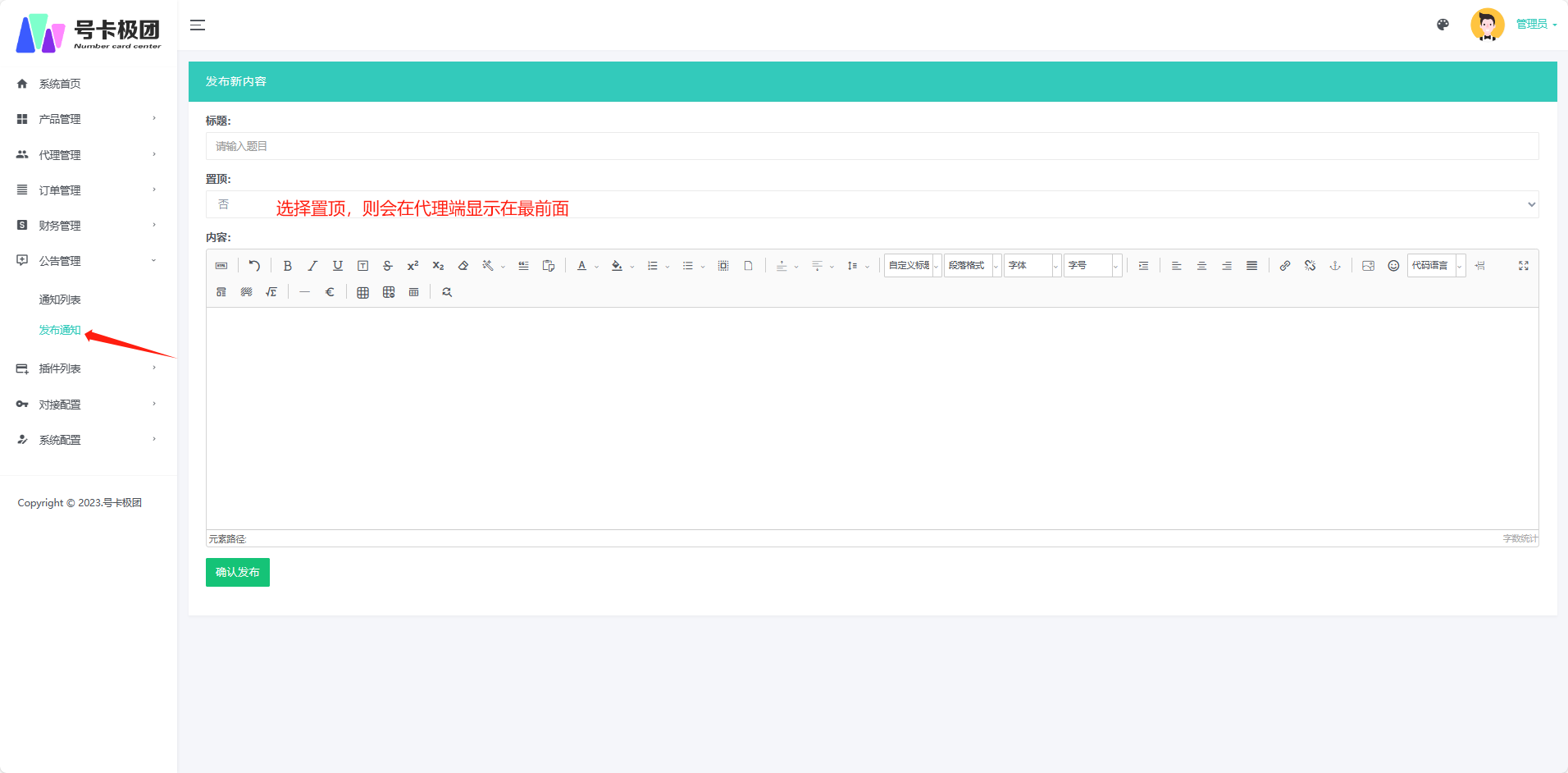 可以发布公告给全平台所有代理,此公告信息不分层级,所有代理登录后均可看见发布的最新公告。