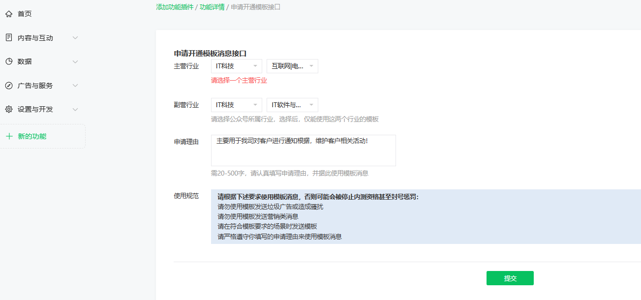 全部配置完成后,申请模板消息
