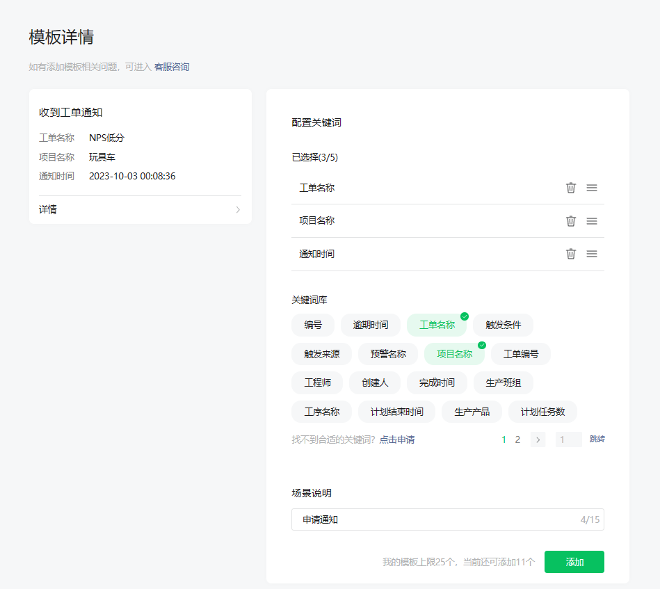 * 模板编号:42925 标题:收到工单通知 所属类目:软件/建站/技术开发 参数:工单名称、项目名称、通知时间