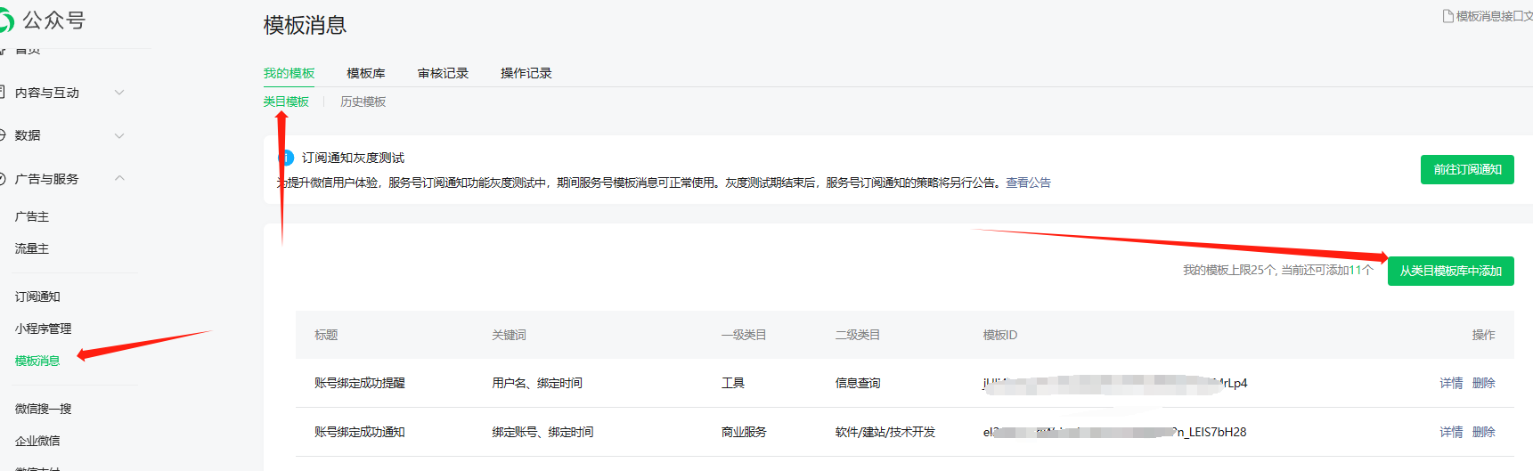 开通模板消息后需先前往公众号详情配置服务类目: