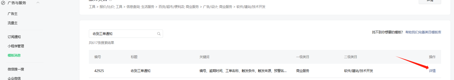 添加服务类目后,依据下图及模板标题搜索添加对应模板消息