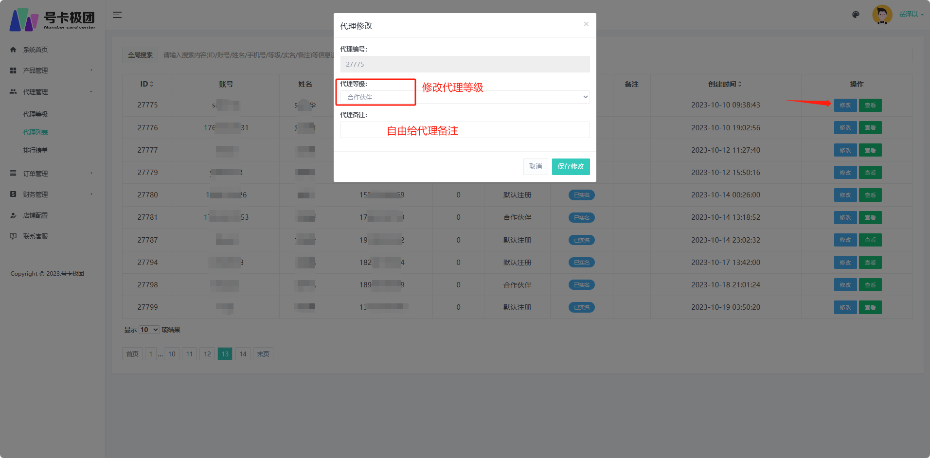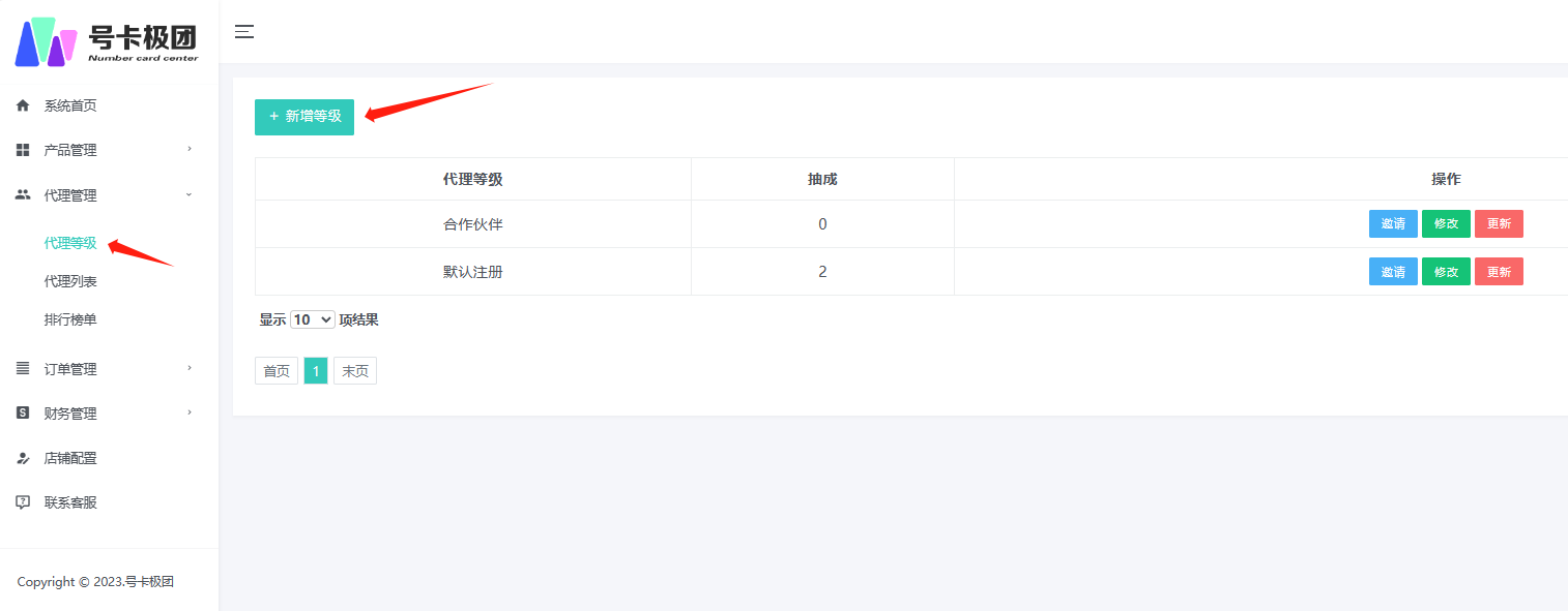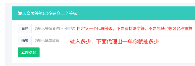 可点击代理等级--新增等级来创建三个代理等级,招收不同等级的代理。