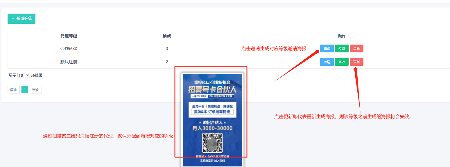 可点击邀请生成对应等级的邀请海报,通过邀请海报注册的用户自动分配到该等级分组