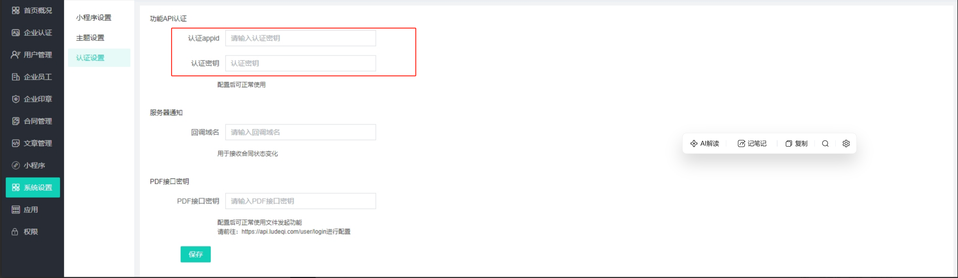 第一步配置api,只需要配置功能API,配置后直接保存即可。