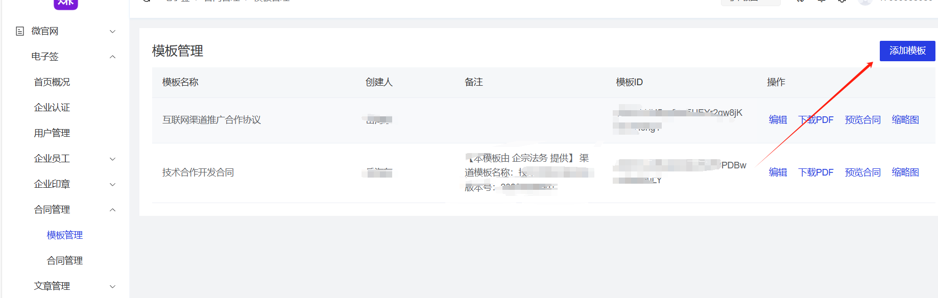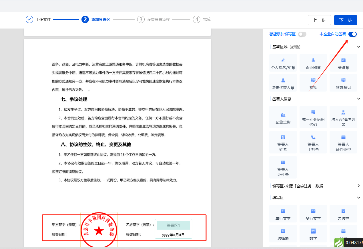 签署区,需要添加已方企业印章和签署方区,且需要开启本企业自动签署。