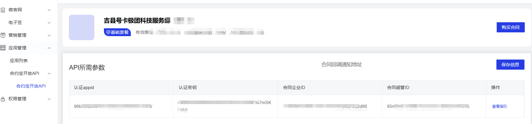 然后前往应用中心获取相关api信息配置到系统合同即可。